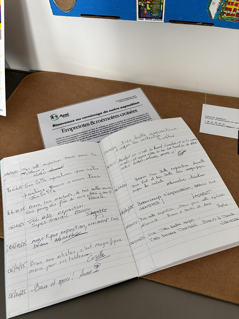 Clôturée le 17 octobre 2025, l’exposition éphémère Empreintes & mémoires croisées a accueilli plusieurs dizaines de visiteurs dans les locaux du siège social de l’Association de Parents d’Enfants Inadaptés de Saint-Amand-Montrond dont le vernissage a eu lieu le 26 septembre 2025 en présence d’une soixantaine de personnes parmi lesquelles des membres du conseil d’administration, de l’équipe de direction, les artistes, leurs familles et leurs amis. Guidée par une artiste intervenante, une trentaine de personnes, accompagnées par l’ESAT Vernet Industriel dans le cadre d’une activité artistique de soutien, ont restitué au public le fruit des recherches et des explorations artistiques menées chaque vendredi, au cours des dix-huit derniers mois. |