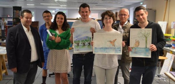 Le Lions club de Saint-Amand poursuit son objectif d’encourager la pratique artistique locale ! Dans le cadre du concours d’affiches de l’environnement, six œuvres ont été réalisées par les usagers de l’Apei (Association de parents d’enfants inadaptés) de Saint-Amand membres de l’atelier d’art encadré par Ludivine Barbault sur le thème « Là où il y a de l’eau, il y a de la vie ». Âgée de 45 ans, Marie-Neige Suarez est la grande gagnante : son affiche, mêlant aquarelle et crayon sur du papier carbone, est arrivée en tête au niveau du district avec 100 points. N’étant pas présente à l’atelier le 12 juillet, jour de la remise des prix, Éric Lecland et Thomas Borghol lui ont transmis de vives félicitations au nom du club service. Des chèques-cadeaux d’une valeur de 100€ reviendront à la lauréate pour son travail et son talent. Une carte-cadeau de 50€ a par ailleurs été remise à Ludivine Barbault pour récompenser, à titre collectif, l’atelier de pratique artistique de l’Apei. « La plupart des affiches ont été réalisées à quatre mains, précise l’animatrice de l’atelier, elles se construisent de concert. » Claude, 48 ans, a participé au concours, de même que Sébastien, 32 ans : « l’atelier me détend et m’inspire pour l’avenir », confie le jeune homme. Pour l’édition 2024-2025 du concours, le thème portera sur « Les oiseaux unissent le monde ».