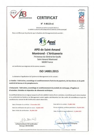 La certification ISO 14001 – N° A 06123-a1 du système de management de l’environnement des Entreprises Adaptées L’Artisanerie et Le Verdier de l’APEI de Saint-Amand-Montrond a été renouvelée par l’organisme AB Certification.